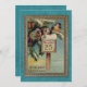 Beautiful, unique, classic, trendy, pretty and decorative Christmas greeting card on a vintage teal blue colored background, with an antique brass or gold looking nouveau deco frame, image of an cute birds looking over a calendar and the date of December 25th. With heartfelt poem message on the backside of the card, which can be customized or personalized with a personal text and signed with your family name or individual family member names of your choice.