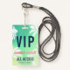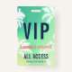 Perfect for summer concerts, music festivals and large event venues, this customisable badge features a background of white palm tree silhouettes against tropical green background, with white and coral text overlays. Customise for VIPs, staff, press or other uses, with four lines of text on the front. Add additional event information to the back of the badge in white lettering on turquoise.