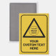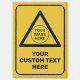 Triangle shaped yellow warning sign. Custom image. Custom background colour. Custom text.