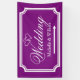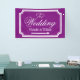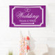 Wedding directional sign banners in custom colours. Indoor and outdoor quality. Elegant personalised royal purple and white wedding direction sign pointing left or right. Turn arrow to your preference. Help guests find their way to your reception party. Classy design with stylish border, interlocking hearts and name of bride and groom couple. Fancy script typography. Available for left and right direction. Personalizable directional road signage to hang up on fence or wall. Also handy for parking or cocktail bar in different locations. Available in different sizes for inside and outside. Small medium and large shapes. With or without holes and hooks. Black and white or customisable background colour. Add names to the template.
