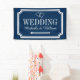 Wedding directional sign banners in custom colours. Indoor and outdoor quality. Elegant personalised navy blue and white wedding direction sign pointing left or right. Turn arrow to your preference. Help guests find their way to your reception party. Classy design with stylish border, interlocking hearts and name of bride and groom couple. Fancy script typography. Available for left and right direction. Personalizable directional road signage to hang up on fence or wall. Also handy for parking or cocktail bar in different locations. Available in different sizes for inside and outside. Small medium and large shapes. With or without holes and hooks. Black and white or customisable background colour. Add names to the template.
