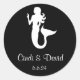 Round sticker is shown in a black and white colour combination with a mermaid print.