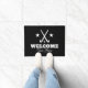 Custom welcome door mat with field hockey sticks and ball logo. Black and white entry rug with personalised family name or personalised text. Athletic typography with sporty logo. Available in small and large size. Customisable colours. Great for home or sports club