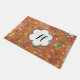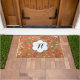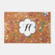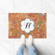 A beautiful design featuring flying floral birds of wine, teal, and white on an orange rust coloured background full of pretty little wildflowers and dandelions of teal, white, and wine. This fun, colourful, whimsical door mat features a white flower shape banner that you can easily personalise with your monogram initial!