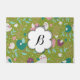 Pretty, colourful, cute, whimsical describes our Whimsy Tweety Birds on Vines design doormat. Features little birds of teal, wine, white, and pink on aqua vines with little white flowers, pink swirls, all on a green background. This fun, colourful, whimsical door mat features a white flower shape banner that you can easily personalise with your monogram initial!