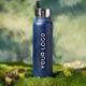 Custom navy blue branded water bottle features your professional business logo design, along with wording for your business name, slogan, website, location, or other information that can be personalised. Simply add your company logo to the white rectangular placeholder image space, and fill in with your preferred wording.