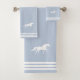 Three stripes on light blue and custom white horse image. Elegant modern towel set.