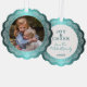 Contemporary classic Christmas holiday season ornament card with ivory cream off-white coloured mandala wreath on a classic ocean blue faux metallic background. With option and room to customise the text, family name and year date, and add a personal photo of your choice on the front, and a customisable season greeting message on the backside of the card.