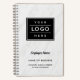 Add a professional look to your workspace with a custom company branded spiral notebook featuring a large space for your business logo with modern custom text that can be personalised with the name of the employee or business owner, business name, location, slogan, website, or other info. Makes a great corporate gift. Includes a faux white Carrera marble background that is printed on the front and back covers.