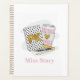 This pre kindergarten teacher planner keeps your lesson plans in one place. Pattern has a white notebook with black polka dots, a gold pk, heart coffee, ruler, pen and pencil. This white notebook with black polka dots design can be found on other items in my shop, PageCreativeDesigns.