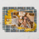 Unique, classy, trendy, pretty and decorative Thanksgiving holiday card. Cute WITH LOVE FROM text and room to customise or personalise with a photo and names (or family name) of your choice. With cute classic warm yellow fall Mums flowers pumpkins on a teal blue, ochre mustard brown and grey coloured rustic farmhouse inspired plaid tartan pattern background design. And a customisable season greeting poem on the backside of the card.