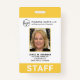 Corporate photo ID badge in a vertical layout. This simple yet professional design features a yellow border on the top and bottom with white in the middle. The template is personalised with your logo, company name, employee name, title, department / location and employee ID. The bottom border has "STAFF" in large bold letters and may be changed to any title desired. The backside has your contact information and instructions for returning if found. This classic design works great for any type of business.