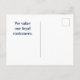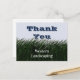 Express your appreciation to your loyal customers with this inexpensive promotional postcard. The postcard features painted dark green grass and a light blue "sky". "Thank You" peeks out from behind blades of grass. Your company name appears in professional white font against the green landscaping. The back of the card allows plenty of room for additional words of appreciation which can be customised to suit your business needs.