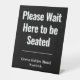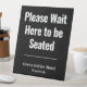 Restaurant Customer Message. Customer Instructions for Hotel or Restaurant use. Table top signs showing message plus name of business. White lettering. Example says "Please Wait Here to be Seated".