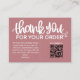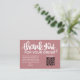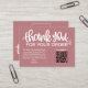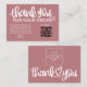 Express your gratitude with our dusty pink Customer Thank You Package Insert QR Code Coupon business card. This thoughtfully designed card features a QR code that leads your customers to an exclusive discount or special offer, showing appreciation for their loyalty. Make a lasting impression and strengthen your customer relationships with this personalised and stylish gesture.