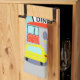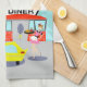 Serve up something special with this Customisable 1950's Diner Kitchen Towel. The cartoon drawing design features a red brick building with blue windows, grey double doors, and a white sign that says, "Diner" perched on the roof. In the parking lot, a second sign is on a pole. The sign has a turquoise background and a flashing red arrow pointing the way to, "Deb's Diner." You can personalise the name on the sign for a truly, one-of-a kind gift! The sign has done its job because there is a bright yellow car with fins parked next to it. Even though we can't see them, the passengers of the car must be smacking their lips. A cute, young carhop is rollerskating her way to the car. Her brunette hair is in a bouncy ponytail. She is wearing a short, pink uniform with black trim and a white apron. Balanced on one hand, the carhop is carrying a black tray holding a giant hamburger and a refreshing, old-fashioned, glass bottle of soda. The background behind the diner is teal with light blue clouds and the silhouettes of cedar trees.