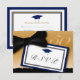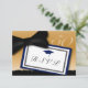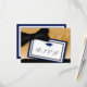 This elegant gold and black bow tie RSVP has a dark blue mortar board and dark blue accent colour. Classy RSVP card for a 50th reunion!