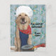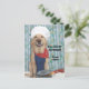 A yellow Lab in an apron, bone bandanna, and chef hat with a pot with chicken legs hanging out. You can use it for a funny postcard or a funny customisable invitation to have friends over when you cook out or BBQ.