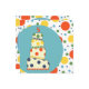A customisable birthday party invitation featuring a background of youthful shades of orange, green, yellow, and blue on front and back. Front features illustration of an off white birthday cake with four off centred rounded tiers over large blue dot. Cake is decorated with colourful dots. Customise the number at top of cake. Personalise the back with details of your occasion.