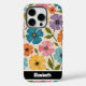 This charming phone cover showcases a vibrant array of textured, impasto oil painting style flowers in cheerful shades of pink, blue, yellow, orange, and purple, complemented by various green leaves, all set against a soft cream background. This artistic, tactile design brings a fresh and lively garden aesthetic to your device. A sleek black bar at the bottom offers personalisation with a name like "Elizabeth"; if you don't want a name, you can remove it and any other elements you don't like from within the design tool, crafting a truly bespoke smartphone accessory.
