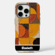 This appealing phone cover showcases a heavily textured, impasto oil painting style, featuring a mosaic of geometric shapes in rich, earthy tones of orange, yellow, brown, and cream, defined by dark outlines. The artistic, tactile design adds a warm, sophisticated flair to your device. A sleek black bar at the bottom offers personalisation with a name like "Elizabeth"; if you don't want a name, you can remove it and any other elements you don't like from within the design tool, crafting a truly bespoke smartphone accessory.