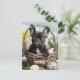 The front of the card features an adorable scene of a black French Bulldog seated snugly inside a woven Easter basket. Surrounding the basket are an array of colourful Easter eggs, each one vibrant and cheerful against the backdrop. The Frenchie wears a playful expression, its eyes twinkling with Easter excitement as it gazes out from the basket