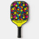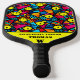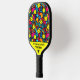On both sides of the paddle, a vibrant array of geometric shapes, predominantly triangles, creates a captivating visual. The triangles form the foundation of the pattern, creating an energetic grid-like backdrop. The lively colours include bright shades of green and blue, representing the pickleball court and the sky. The bold black borders provide a sharp contrast, reinforcing the structure of the design.