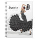 Soft bound notebook with custom text and a pretty illustration of a flamenco dancer in a long black polka dot dress.
