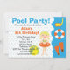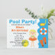 This summer pool party birthday party invitation features a little girl with blonde hair surrounded by her pool toys including an inner tube, beach ball, flippers and a swim mask. Completely customisable.