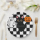 A paper plate with a ghost, black cat, and orange pumpkin. Text can be edited or removed. Perfect for a Halloween party. Matching cups and napkins available.