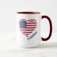 Happy Fourth of July Flag Stars Mug.Celebrate Independecnce Day in style with our July 4th mug, featuring a virbrant red, white and blue colour scheme. This mug is adorned with a heart-shaped American flag and sprinkled with stars,, emodying hte spirit of partriotism and freedom. The distressted text adds a touch of vintage charm, making it perfect for sipping your favourite beverage while enjoying the holiday festrivities. It is Ideal for both casual and festive occasions, this mug is a must-have for any proud American. Text on both sides is customisable.