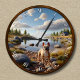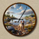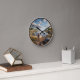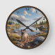 • This customisable clock features a cheerful French Bulldog on a peaceful lakeside with natural rocks, lush greenery, and a cosy cabin in the background.
