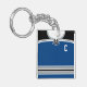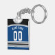 Easy to edit ice hockey / lacrosse / sports jersey keychain, just use the boxes to the right of the image to insert your own choice of name and number on the back, and a either a captain's 'C', alternates 'A' or a number on the front. This jersey design is blue with black and silver stripes and trim, the background colour can be changed, just click 'CUSTOMIZE'.