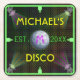 Create your own custom 1970's disco home bar paper coasters using this template. The coasters have a green neon border with four spotlights shining onto a silvery disco mirror ball / glitter ball. The black background has a faint rainbow of colourful squares. These funky coasters can be personalised with your first or last name, initial / monogram and the year your bar or 70's or 80's-themed man cave was established (or the year your party is being held). Just fill in the DIY template or "Customise It" if you need to resize, rearrange or change text colours & fonts. These are perfect for a retro disco-themed party or all year long.
