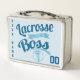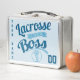 Script design in blue tones with the text LACROSSE LIKE A BOSS and a lacrosse stick and ball graphic.