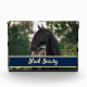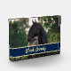 Bring your horse indoors to your home with this customisable photo set! Exchange the picture with one from your own equestrian adventures. Near the bottom is text displayed in a navy and gold colour scheme. Change the text your horse's name. There is plently of space to accomodate a full registered or show name if desired.