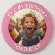 Customisable photo and name - IT'S MY BIRTHDAY - button. Light pink frame with white font.