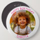 Customisable photo and name birthday button. Pink text on a small white frame.