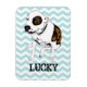 This modern refrigerator magnet design features a cartoon illustration of a Pit Bull Terrier with a teal and white chevron pattern background. Customisable text for your pet's name!