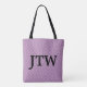 Personalise your purple and white chevron pattern tote bag with your own monogram. Monogram text is centred in black letters.