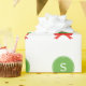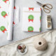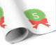 Customisable Christmas wrapping paper. The pattern has monogrammed green circles with red bows that look like Christmas wreaths. Cute personalised gift wrap for the holidays!