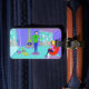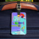 Brrr... This Customisable Retro Ski Vacation Luggage Tag will have you looking around for a Saint Bernard with a cask of brandy. The mid century modern cartoon drawing features a glamourous couple cooped up in a colourful ski chalet with a magnificent view. The room has a turquoise floor and purple walls. Hey, it's the 60s! Floor to ceiling windows reveal snow covered mountains, a turquoise sky with light blue clouds, and the silhouettes of happy people whizzing by in ski lift gondolas. Inside the room, we see an olive green, cone fireplace with a glowing fire. Tossed on the floor are two yellow skis next to ski poles. In the centre of the room, a handsome man with black hair is wearing blue pants and a green turtleneck sweater. He is carrying a tray of martinis. One arm is outreached, offering a martini to a blonde woman's waiting hand. The woman, is sitting in a red, egg chair. She is wearing navy blue pants and a hot pink sweater. Please excuse her for not getting up, but she has a cast on one leg! The opposite side features a turquoise background and plenty of room for customising with your contact information. It's easier than falling off a mountain!