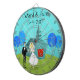 This Customisable Retro Wedding Couple Dart Board will have you hearing wedding bells. The 1960's style, minimalist art design features a bride and groom on their wedding day. The happy couple looks good enough to be standing atop a wedding cake. But they aren't. They're standing on lush, green grass. The debonaire Mr. is wearing a classic, black tuxedo with black bow tie. Down, ladies! He's taken! He is holding the hand of his beautiful Mrs., who looks positively radiant in her tea length, white gown with form fitting waist and flared skirt. She truly looks like a princess with her tiara and gauzy, white wedding veil resting on her pretty blonde head. Beside them, a path in the grass leads to the world's most charming chapel. The quaint, teal and turquoise church is the perfect setting for saying, "I do!" Yes, here is the church. Here is the steeple. We can only assume that, behind those bright red, double doors is a roomful of people just waiting to share in this couple's happiness. The picturesque setting also includes four, stylistic, cartoon trees in shades of blue. It's a beautiful day for a wedding, as we can see from the flawless aqua sky. The only thing missing from this mid century modern design is the rice, and we can assume that will be forthcoming. Personalise with names and date.