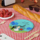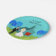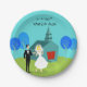 These Customisable Retro Wedding Couple Paper Plates will have you hearing wedding bells. The 1960's style, minimalist art design features a bride and groom on their wedding day. The happy couple looks good enough to be standing atop a wedding cake. But they aren't. They're standing on lush, green grass. The debonaire Mr. is wearing a classic, black tuxedo with black bow tie. Down, ladies! He's taken! He is holding the hand of his beautiful Mrs., who looks positively radiant in her tea length, white gown with form fitting waist and flared skirt. She truly looks like a princess with her tiara and gauzy, white wedding veil resting on her pretty blonde head. Beside them, a path in the grass leads to the world's most charming chapel. The quaint, teal and turquoise church is the perfect setting for saying, "I do!" Yes, here is the church. Here is the steeple. We can only assume that, behind those bright red, double doors is a roomful of people just waiting to share in this couple's happiness. The picturesque setting also includes four, stylistic, cartoon trees in shades of blue. It's a beautiful day for a wedding, as we can see from the flawless aqua sky. The only thing missing from this mid century modern design is the rice, and we can assume that will be forthcoming. Personalise with names and date.