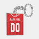 Easy to edit soccer / football / sports jersey keychain, just use the boxes to the right of the image to insert your own choice of name and number on the back. The design of this jersey is red with white v-neck trim. The background colour can be edited, just click on CUSTOMIZE.
