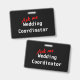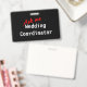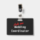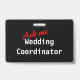 This black badge says "Ask Me" in red script. Also you can personalise the badge with your title such as "Wedding Coordinator".