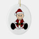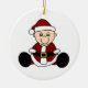 A baby dressed in a Santa suit and stocking cap on an ornament you can easily customise with your own text before ordering.