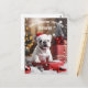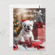 Presenting the "Winter Whiskers Wonderland postcard"! Envision a delightful flat card that encapsulates the pure joy of the holiday season. The front boasts an adorable image of a joyful white French Bulldog puppy, seated in front of a beautifully decorated Christmas tree adorned with vibrant red baubles. The playful pup, with its tongue happily out, sets the scene for a heartwarming and festive Christmas celebration, surrounded by carefully wrapped presents.