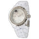 I had two concerns when ordering this watch - one that the watchband didn't look that glittery and two that the dial would be too large. Neither was a problem at all. The watch band is nice and glittery for a touch of bling. As to the size, I have small bones so I tend to like smaller looking accessories and I am quite comfortable with this. Neither too large or too small. The outside edge to edge on the dial is 1 1/4" the inside image is 1 inch.