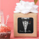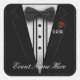 A black tuxedo with a bow tie and a red rose with a starry night background.